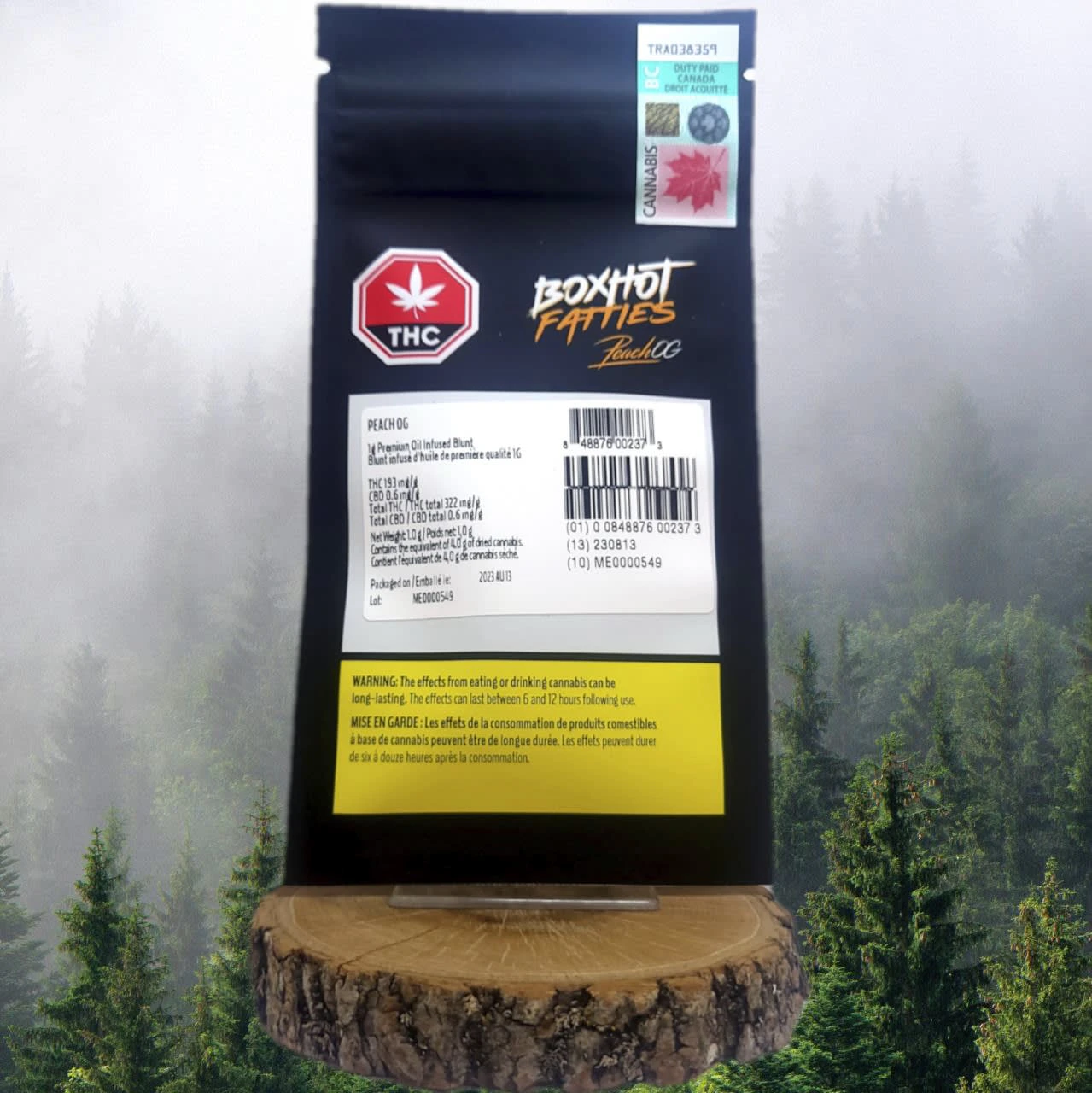 BOXHOT PRESENTS: Peach OG Fatties, 1g blunts infused with pure cannabis distillate and the same strain-specific flavours you've come to expect from BOXHOT. Each of the Peach OG Fatties feature over 30% THC and 5% terpenes, boasting a sweet flavour with a fruity aroma, complimented by complex earthy undertones. All BOXHOT Fatties are produced with chamomile-based wraps.