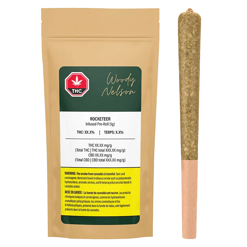 The Woody Nelson Rocketeer is an infused pre-roll made with Woody Nelson's flower and bubble hash from High Fidelity. The flower is grown in organic living soil, cured for a minimum of three weeks and never irradiated. The hash is made using ice-water extraction and blended with the flower to ensure a slow and even burn. Each 1g pre-roll comes in a reusable doob-tube and is made in Nelson, BC.