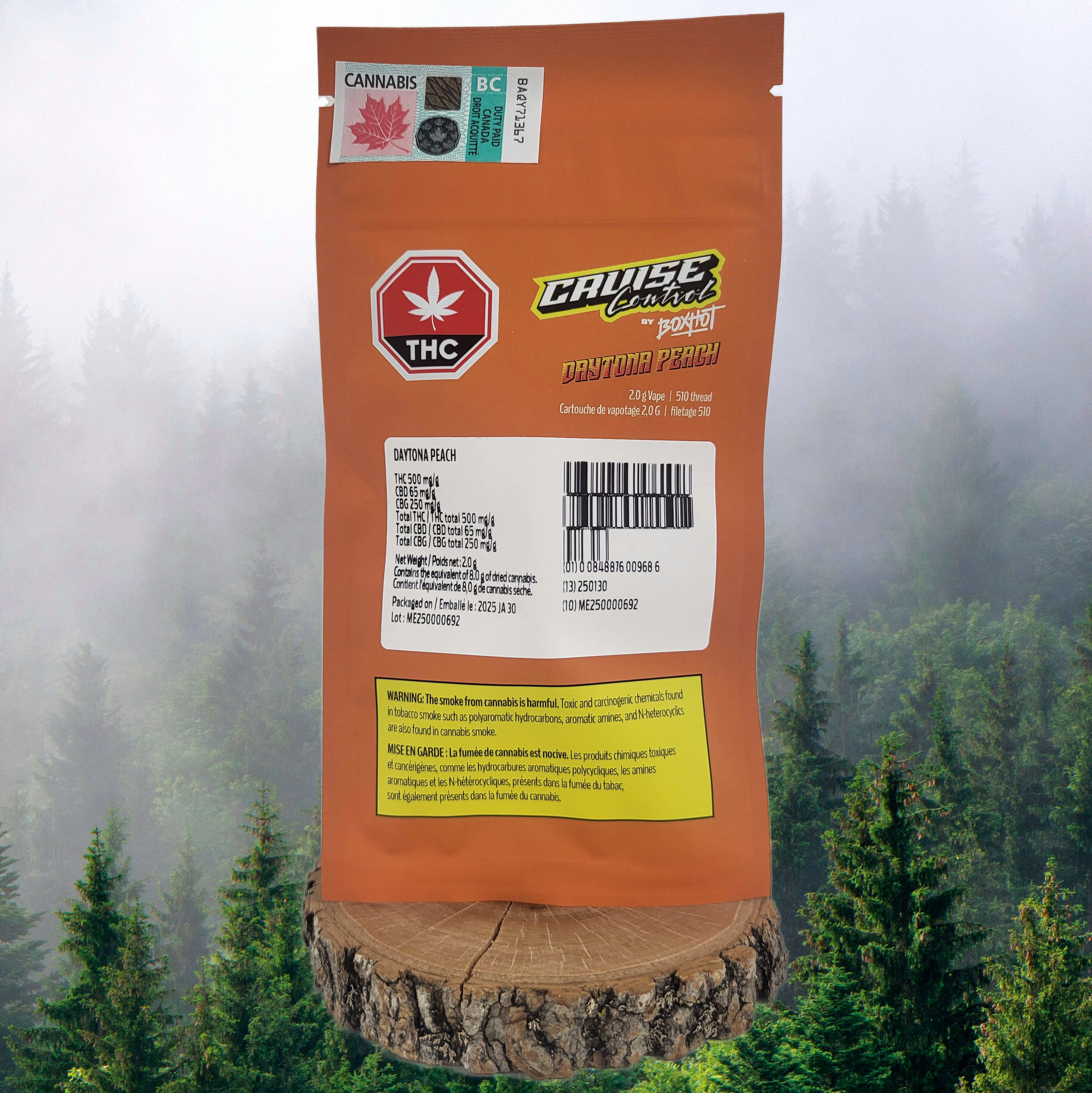 Tricked out with tart, juicy flavour and a tankful of CBG, this peachy vape is sure to impress. The BOXHOT Cruise Control Daytona Peach 2.0g vape cart gets you where you're going. With oversized hardware, 1000mg of THC, 500mg of CBG, and some of the highest quality, botanical-terpene-infused distillate out there.
