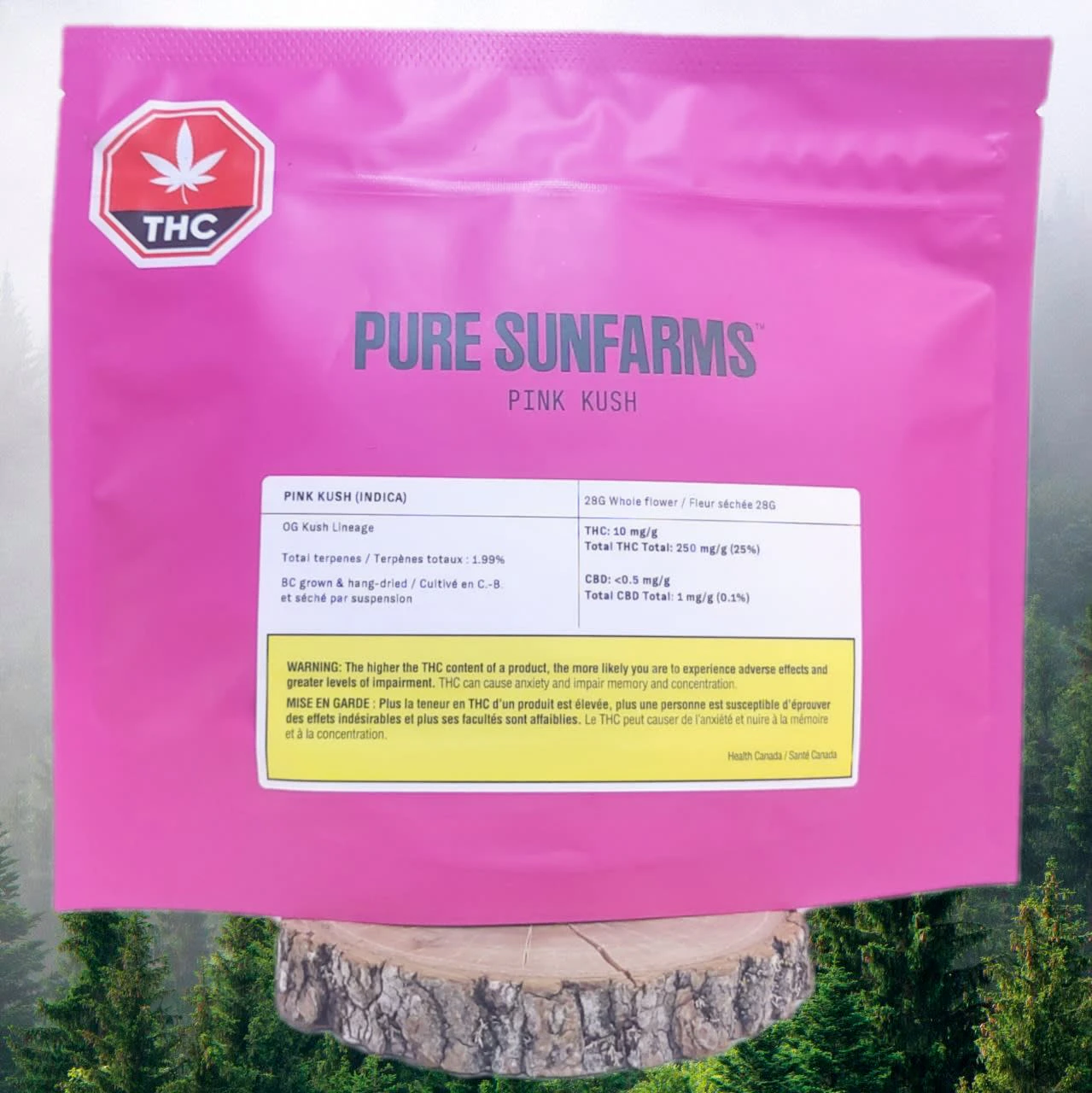 Pure Sunfarms' cut of Pink Kush from BC's Vancouver Island is a coastal relative of the legendary OG Kush. This special cultivar is known for its strong aromas, colourful flowers, and high-THC potential. Beneath a thick coating of trichomes, the dense and round buds feature forest green leaves, often with a purple hue, mixed with dark amber pistils. Pink Kush showcases gassy aromas of white pepper, orange, butterscotch, coffee, earth, and grapefruit. Terpenes include caryophyllene, myrcene, and humulene.