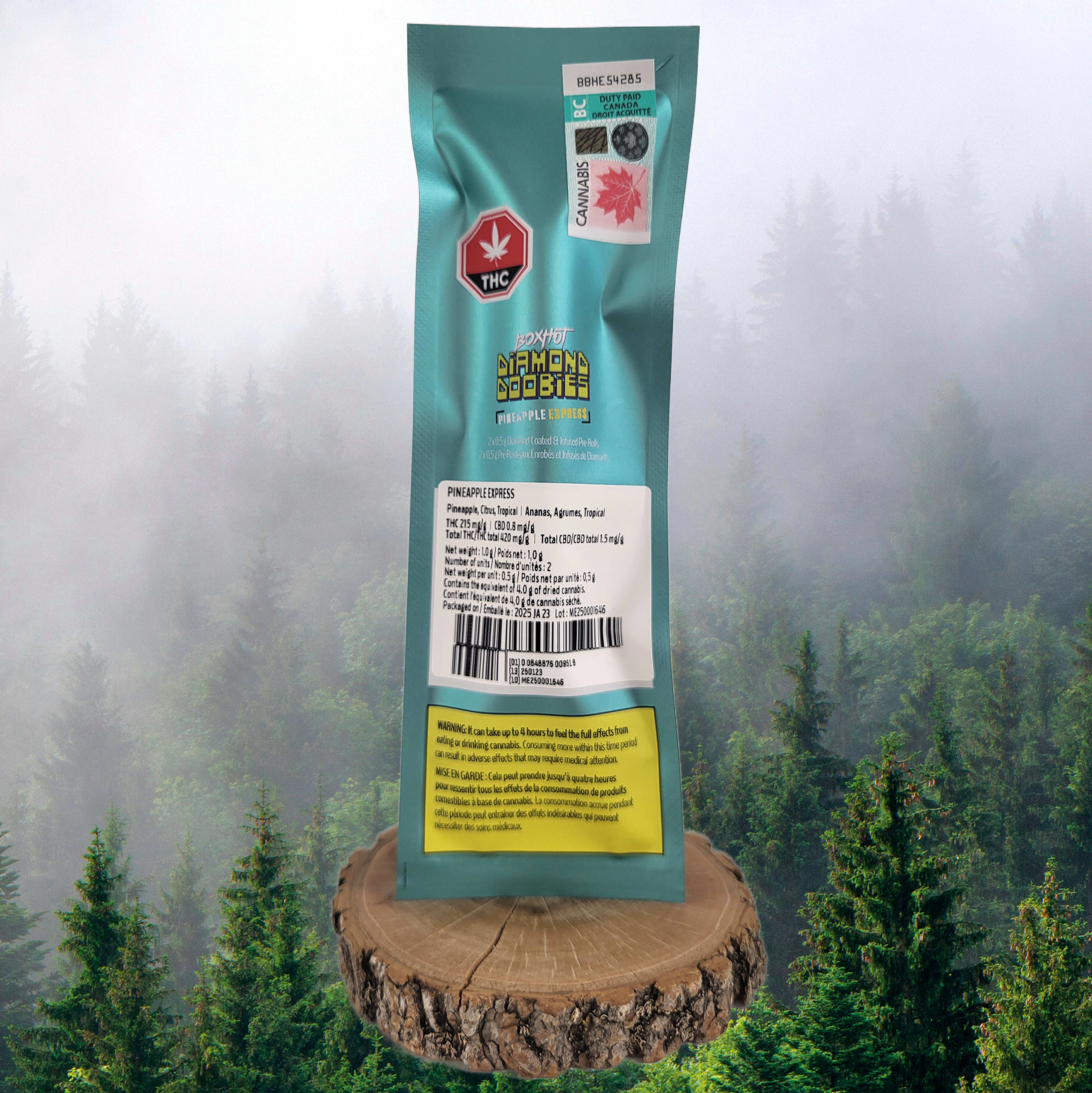 BOXHOT Pineapple Express Diamond Doobies Infused Pre-rolls is a monster monsoon of pineapple flavour with a tropical citrus twist. This iced-out sativa duo is infused with a botanical terp-boosted, liquid-diamond blend then coated in a layer of crushed diamonds to deliver a massive hit of potency and flavour.