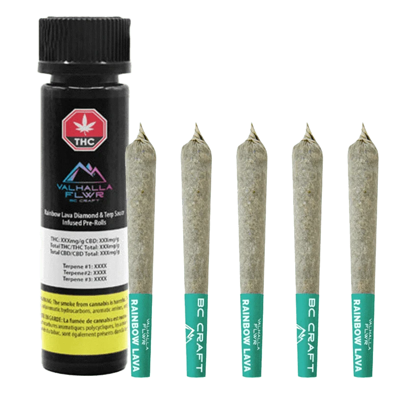 Introducing the 5-pack of 0.5 gram Rainbow Lava Diamond Terp Sauce Infused Pre-Rolls from Valhalla Flwr – taking potency and flavour to new heights. Crafted with whole-milled flower and infused with Rainbow Lava diamonds and terpene-rich sauce, these pre-rolls delivers explosive flavour and potency. Whether you're a seasoned connoisseur or a craft flower lover, Rainbow Lava offers a one-of-a-kind experience.